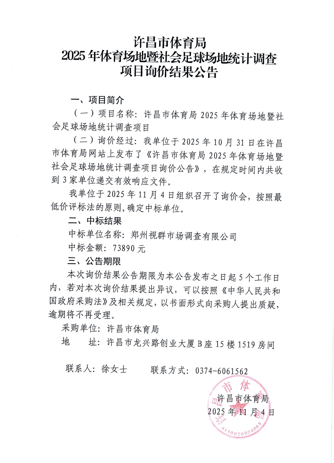 许昌市体育局2025年体育场地暨社会足球场地统计调查项目询价结果公告