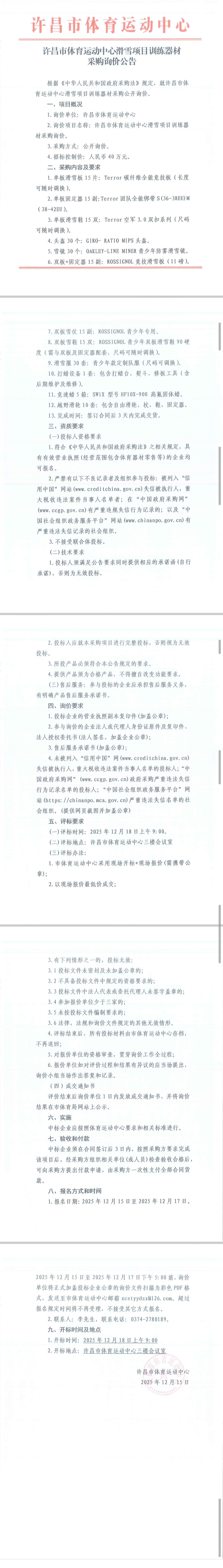 许昌市体育运动中心滑雪项目训练器材采购询价公告