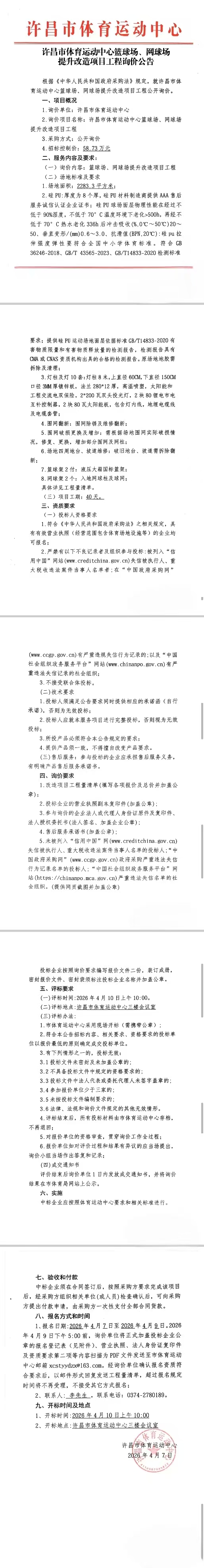许昌市体育运动中心篮球场、网球场提升改造项目工程询价公告