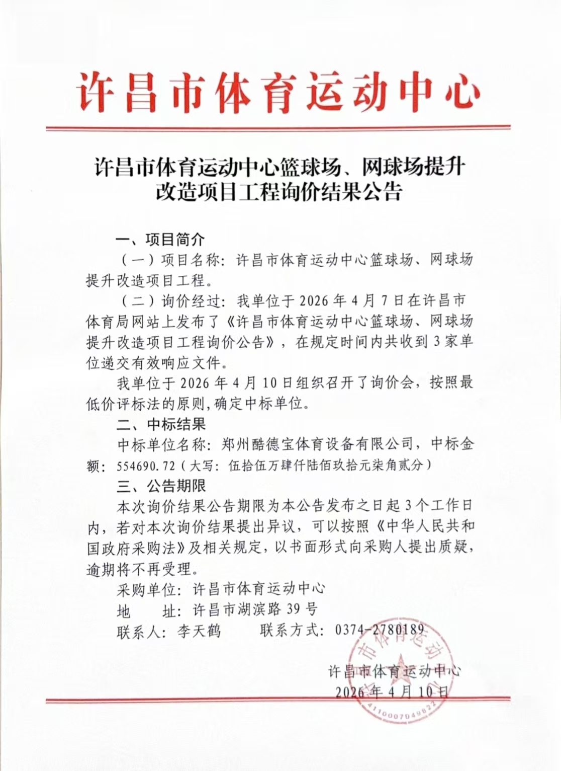 许昌市体育运动中心篮球场、网球场提升改造项目工程询价结果公告